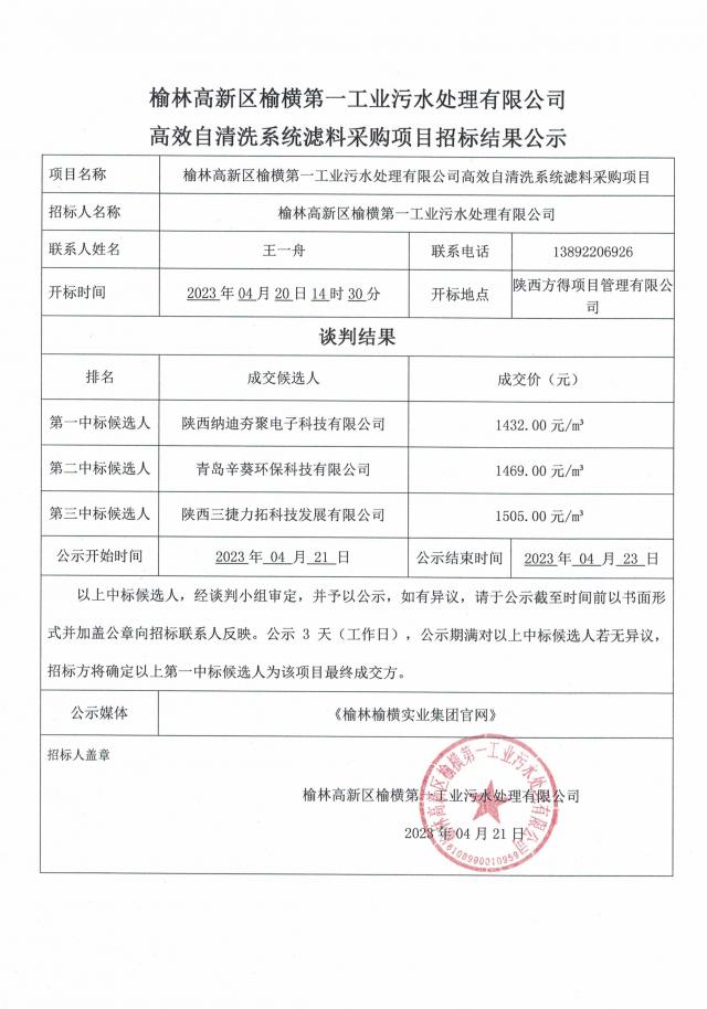 ok138太阳集团区榆横第一工业污水处理有限公司高效自清洗系统滤料采购项目招标结果公示