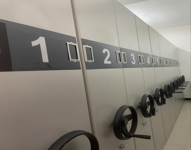根据现有档案室空间大小,设计安装了4组10列共40组密集架。每组密集架为6层双面,每个区移动边列安装柜门,每列都能密封关闭,确保了档案室的保密性、防潮性和美观性。
