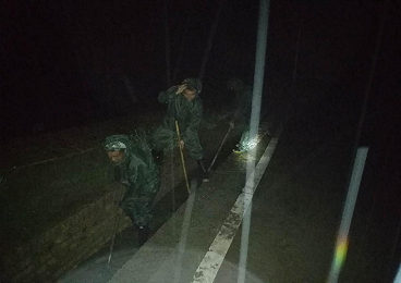 图为:职工疏通排水沟道,确保雨水排水畅通。