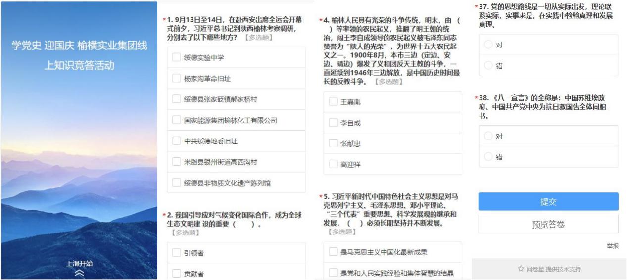 本次党史学习教育知识竞答试卷共设置题目38道,其中多选题6道、单选题16道、填空题10道、判断题6道,满分为120分,内容包括党史、新中国史、改革开放史、社会主义发展史等历史知识及近期相关事实政治内容。榆横实业集团公司干部职工积极参与,通过扫描微信二维码,进入答题界面完善个人信息后,开始电子答题,每人限答题1次,活动参与率90%以上、答题平均分104.48分。