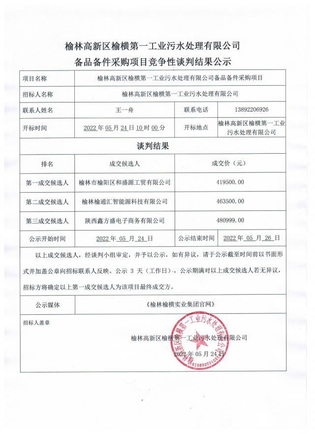 ok138太阳集团区榆横第一工业污水处理有限公司 备品备件采购项目竞争性谈判结果公示
