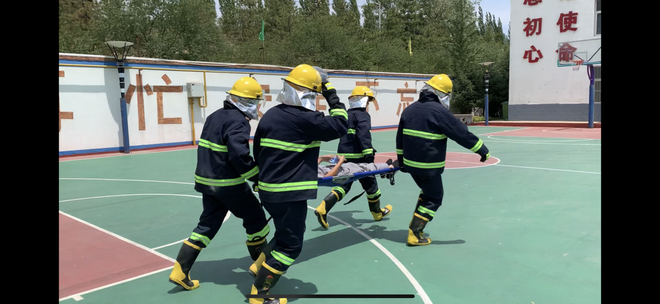 随后被困人员致烟熏昏迷为背景。灭火救援组以“微型消防站”的综合能力,从接到火警后迅速出警,快速准确地完成了灭火器灭火、担架转移被困昏迷人员等系列动作