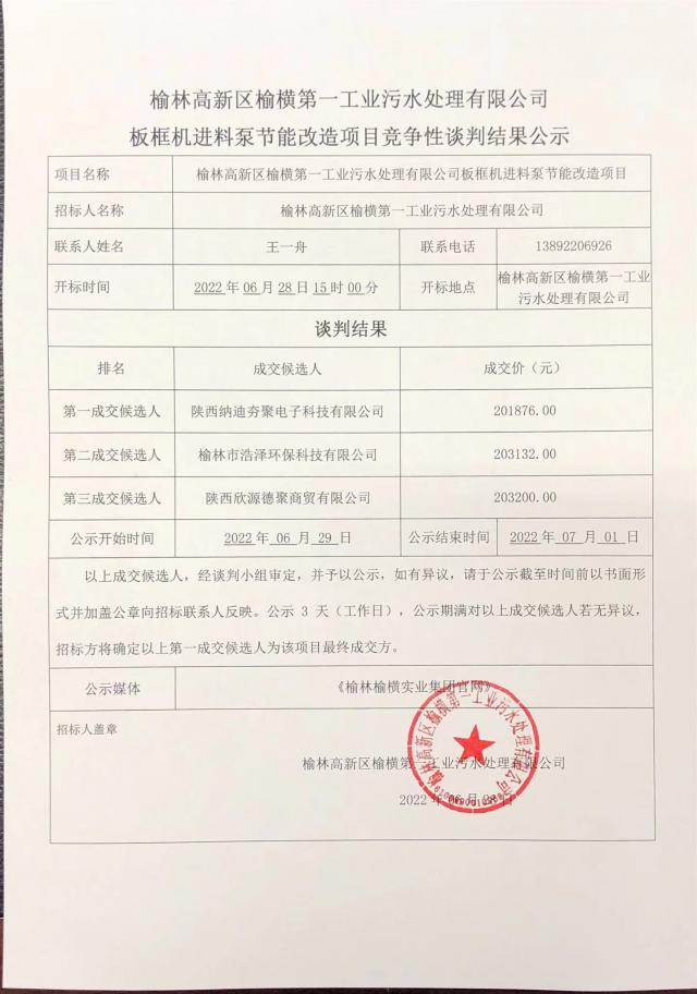 ok138太阳集团区榆横第一工业污水处理有限公司 板框机进料泵节能改造项目竞争性谈判结果公示