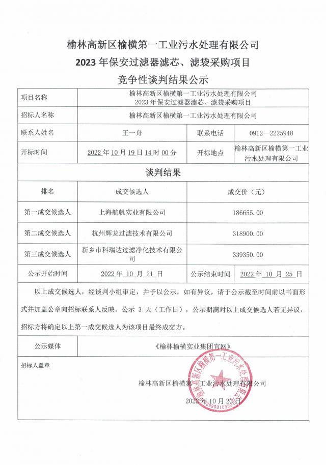 ok138太阳集团区榆横工业第一污水处理有限公司2023年保安过滤器滤芯、滤袋采购项目竞争性谈判结果公示