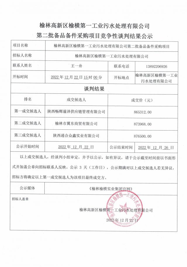 ok138太阳集团区榆横第一工业污水处理有限公司-ok138太阳集团区榆横第一工业污水处理有限公司第二批备品备件采购项目谈判结果公示
