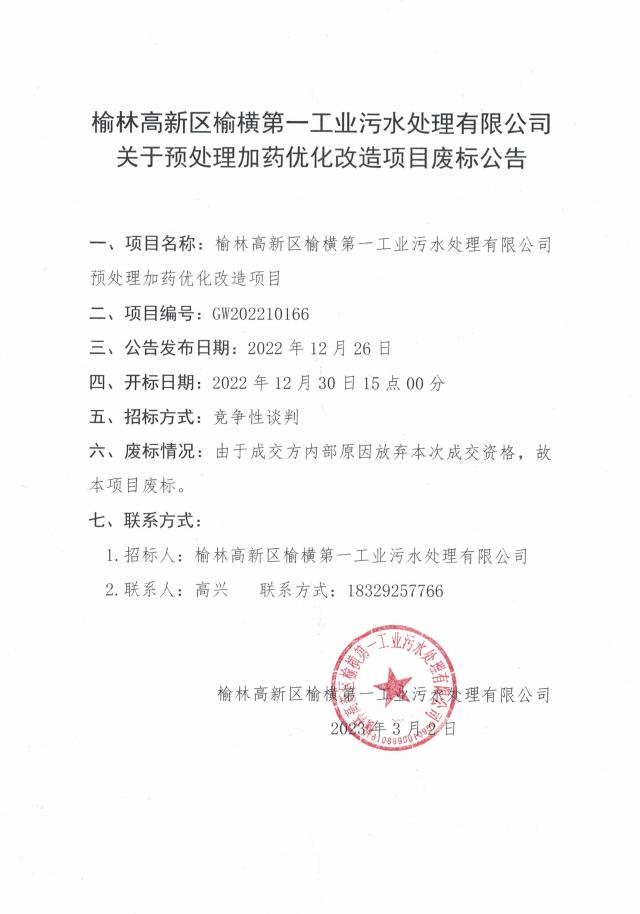 ok138太阳集团区榆横第一工业污水处理有限公司关于预处理加药优化改造项目废标公告